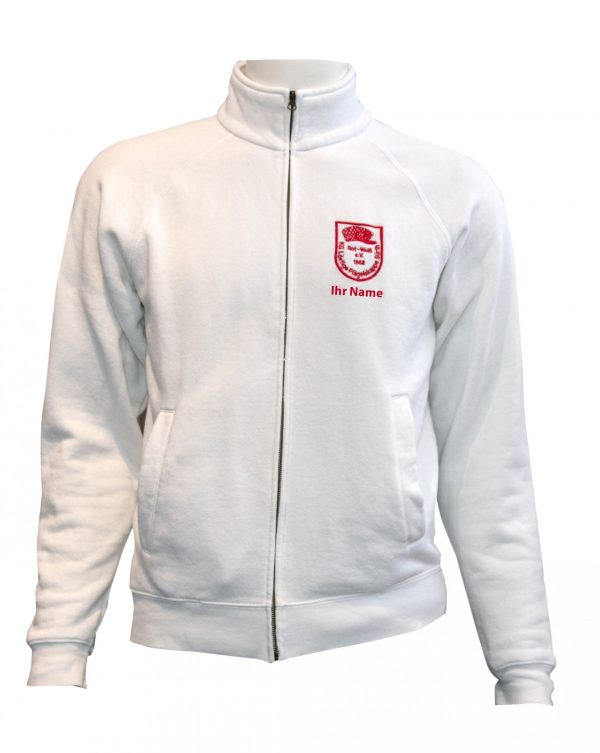 Weiße Herrenjacke bestickt. Bitte geben Sie im Bereich „Kasse“ im Feld „Zusätzliche Informationen“ den zubestickenden Namen an!